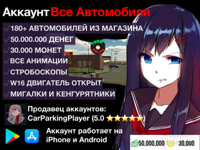 ✨После оплаты сразу нажмите наверху “Данные товара” там сразу же будет Email и Пароль - введите в игре и можете играть✨ ⚠️ На аккаунте нет машины CLS банан и Тойота Краун! Также нет Машин новинок из последнего обновления (аккаунты были созданы До обновления в игре) Всего около 180+ Машин есть ⚠️ Машины Ламборгини есть только на версии для Айфон, а на Андроид их не было и не будет - это особенность самой игры Спасибо за понимание ✔️ 180+ Авто из Магазина игры, включая Премиум как M5 F90 Всего 180+ Автомобилей, Стоковые из магазина (не винилы) 🚘 ✔️ 30.000 Монет 🟡 ✔️ 50.000.000 Зелёных Игровых Денег 💶 ✔️ W16 Двигатель донатный открыт - можете сами ставить его за зеленые деньги на разные машины ✔️ Дым цветной разблокирован (и Фары цветные тоже) В настройках машины можете выбрать любой цвет дыма 🔥 ✔️ Мигалки и кенгурятники 🚨 ✔️ Все Эмоции (Анимации) 💃 🛍️ После покупки вы получите: 1. Данные для Входа в Car Parking (Логин и пароль) 2. Если нужен вход в Почтовый ящик вы просто создаете его сами (зарегистрируете на себя и все). Вам нужно будет это сделать если вам нужен Мировой рынок 3. Пароль в игре поменять можно, если захотите (инструкция будет выдана) Аккаунт лично Ваш и никто туда кроме Вас не зайдет ✅