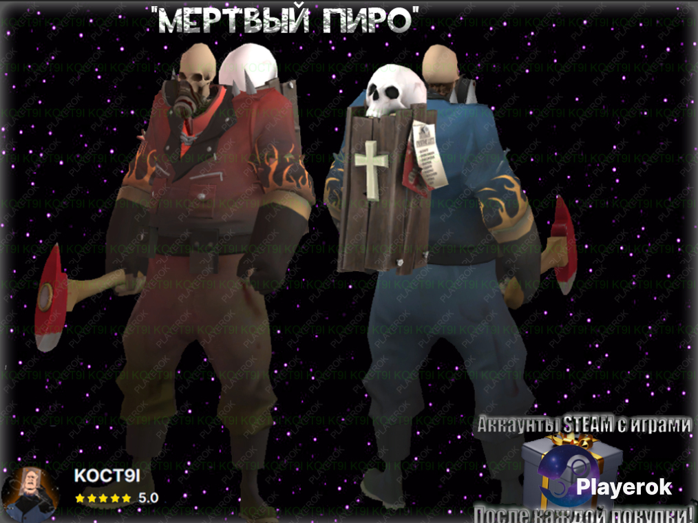 У солдата и скаута зомби сеты меняют озвучку(добавляют фразу) Проклятая душа(зомби) работает только на Хэллоуин или на серверах сообщества, или в полнолуние. ✅ выдается любой 1 сет из фоток товара. 🎁 Данные от оффлайн стим-аккаунта с 🎮GEOMETRY DASH + 🎮Tom Clancy's Rainbow Six, GTA 5, THE WITCHER 3 и еще куча других: Если покупка не первая, другие акки стим с топ играми: 🎮BUCKSHOT roulette🎮Black Myth: Wukong🎮MK11🎮Cyberpunk 2077🎮Почти все культовые сингл-плеер игры :) 🤔Как происходит сделка? 💗Товар я вам передам трейд-ссылкой. Если вы не знаете как её найти инструкция будет в авто-выдаче! Если потребуется — добавлюсь в друзья, от вас нужна просто трейд-ссылка :) ✅Товар полностью ваш. Вы сможете перепродать его / перековать / перекрасить по возможности, и так далее. ❌ Если будут проблемы и вопросы, пишите, стараюсь отвечать быстро!