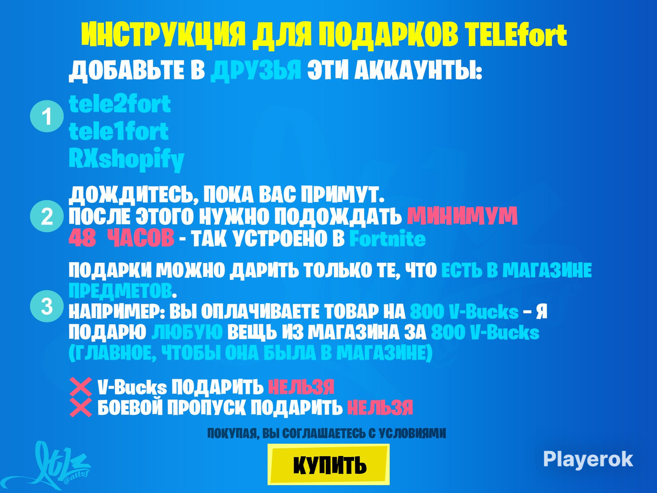 🎮 Хочешь подарки в Fortnite? Добавляйся в друзья заранее! 💌 👤 Мои аккаунты: 1️⃣ AMD RX 0001 2️⃣ AMD RX 0002 📩 Кидай заявку прямо сейчас! ⏳ Важно знать: после того как я приму тебя в друзья, нужно подождать 48 часов ⏳ 🎁 Только потом можно будет получить подарок — такие правила Fortnite. ⚠️ Учти: ✔️ Дарим тот предмет из магазинчика, который вы попросите ❌ В-баксы на баланс не переводим и не дарим! ❌ Баттл-пасс (БП) не дарим!