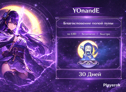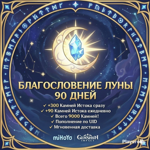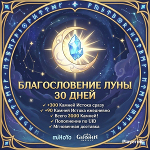300 Кристаллов сразу + 90 Камней Истока каждый день в течение 30 дней 🌙 Благословение полой луны прямо на ваш аккаунт — самый выгодный способ получения валюты ⚡ Зачисление по UID — быстро и без входа в ваш аккаунт 🎁 Максимальная безопасность — не нужны данные для входа или коды подтверждения 🔒 Благословение полой луны — это платная подписка в Genshin Impact, которая даёт мощный бонус: 300 Кристаллов Сотворения сразу при активации и 90 Камней Истока ежедневно в течение 30 дней. Это один из самых выгодных способов получения валюты в игре! ⚡ Как это работает? 1. Оформите покупку Благословения полой луны 2. При оформлении укажите ваш UID 3. Получите быстрое зачисление — без передачи данных аккаунта 🔎 Как найти свой UID: 1. Откройте игру Genshin Impact 2. Нажмите на значок Паймон в левом верхнем углу экрана 3. Скопируйте ваш UID — это набор цифр под аватаром Убедитесь, что UID указан правильно, так как мы активируем подписку именно по нему. Что нужно знать 💡 1. Ежедневный вход в игру: Если вы не заходите в игру в какой-либо день, ежедневная награда за этот день не будет начислена. Не забывайте заходить каждый день, чтобы получить все награды! 2. Максимум подписок: На один аккаунт можно активировать сразу 6 Благословений полой луны — это 180 дней подписки. Удобно запастись на полгода вперед и получать ежедневные награды без перерыва! 3. Обратите внимание: Больше 6 активировать нельзя, при активации 7-го и последующих Благословений подписка не продлится, но вы получите 300 Кристаллов Сотворения за каждое. Активируйте Благословение полой луны через Playerok — быстро, удобно и безопасно!