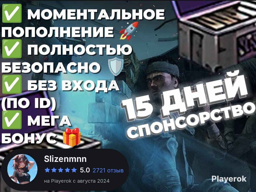 🛍 | Описание: Спонсорство на 15 Дней 🪪 | Пополнение по ID (БЕЗ Входа в ваш аккаунт мною) 🚀 | Средняя скорость выдачи - 5 минут (Если дольше - я сплю/сильно занят) 📞 | Уведомления у меня всегда включены и я всегда на связи 🛡 | Полностью безопасная покупка. Никаких банов нет и быть не может. От вас потребуется только ваш внутриигровой ID и все! 🌍 | Данный товар придёт на аккаунт любого региона и вне зависимости был ваш аккаунт в бане или нет. Товар придет в том объёме который написан в описании, никаких комиссий и недостачи не будет. ❗️ | Моментальным является зачисление доната после моей выдачи ❗️ | Если вы не знаете где ID то я вам подскажу где его найти! 🎁 | МЕГА БОНУС при покупке 💬 | После покупки у вас откроется чат со мной. Можете не беспокоиться что вы останетесь без помощи в случае чего 🤝 | Донат можно подарить другу или любому другому человеку. Просто отправьте его ID 👨💻 | Данный магазин зарегистрирован и оплачивает налоги, соблюдает все правила и нормы данного маркетплейса. Поэтому можете быть уверены в соответствии описания товара с самим товаров