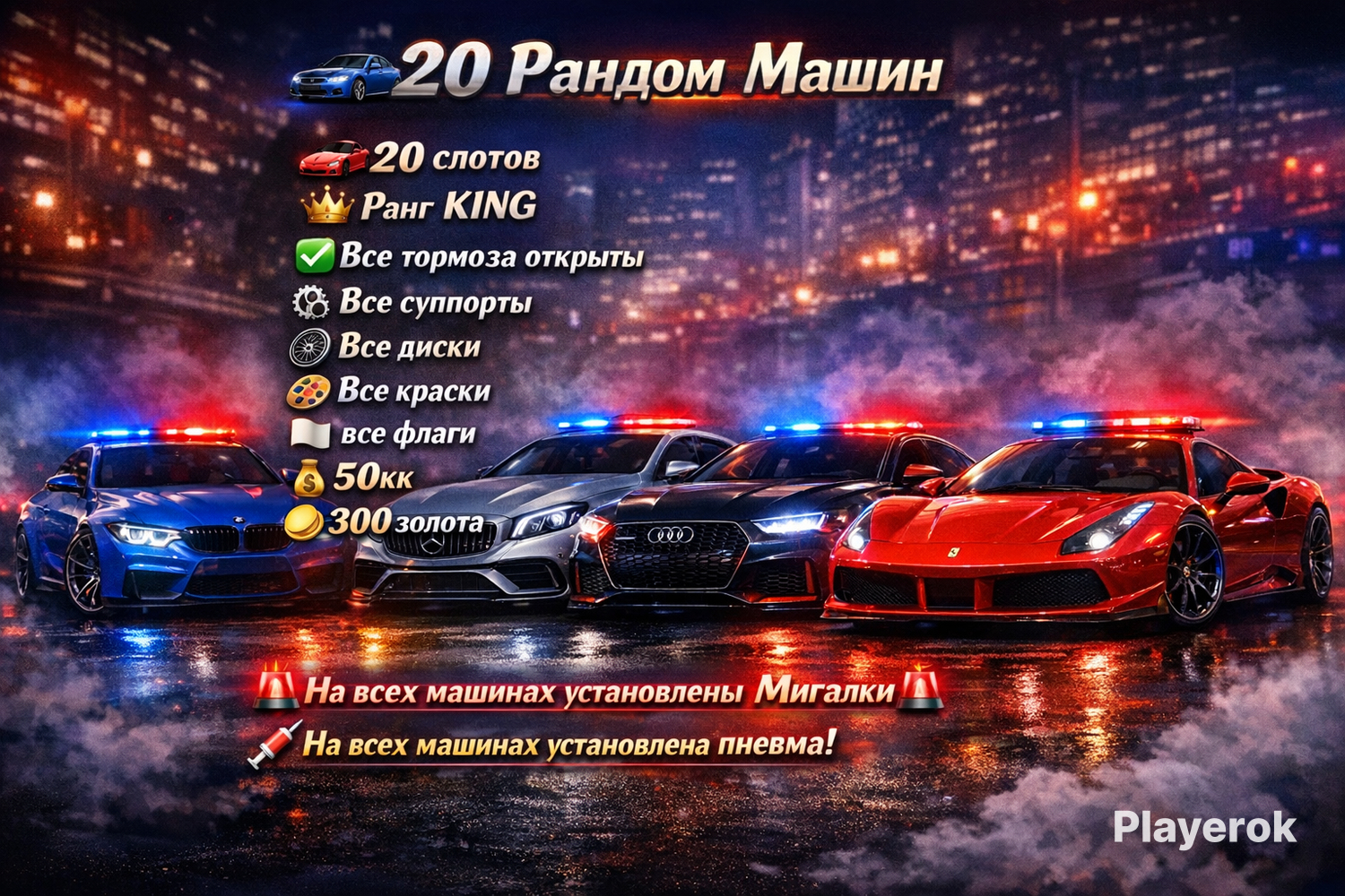 🔥ЖИР АККАУНТ 🔥 🚨Продается аккаунт!🚨 🚘20 Рандом Машин 🏎20 слотов 👑Ранг KING ✅️Все тормоза открыты ⚙️Все суппорты 🛞Все диски 🎨Все краски 🏳️все флаги 💰50кк 🟡300 золота 🚨На всех машинах установлены Мигалки🚨 💉на всех машинах установлена пневма! На все авто на аккаунте наложен Трейд-бан. — Машины нельзя передать или продать другим игрокам. — Весь остальной функционал доступен: на них можно кататься, тюнинговать и менять стайлинг. — Если какие-то авто вам не нужны, их можно удалить. 💰 Возможности аккаунта: Ограничение касается только авто изначально находящихся на аккаунте. Вы можете свободно покупать любые новые машины за монеты или баксы, которые уже есть на балансе! — На новые купленные вами авто ограничения НЕ действуют (их можно будет продавать/передавать без проблем).