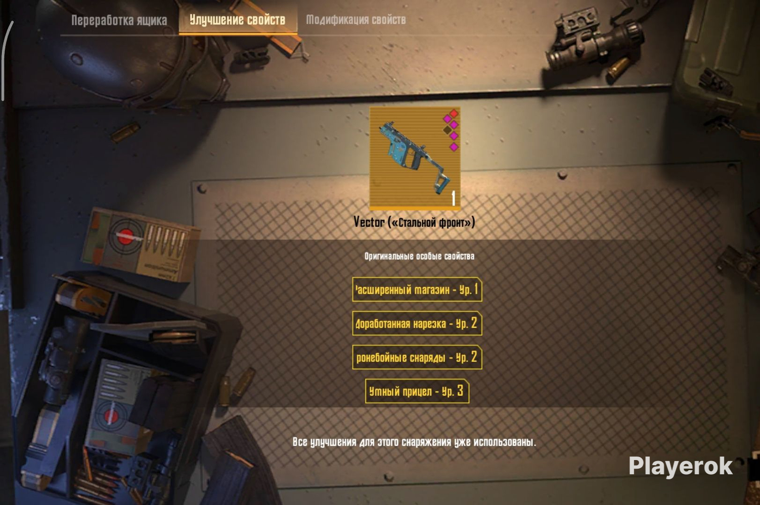 Vector стальной фронт золото Бафы: 1 Расширенный магазин 1 ур 2 Доработанная нарезка 2 ур 3 Бронебойные снаряды 2 ур 4 Умный прицел 3 ур