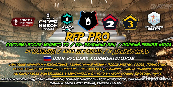 "⚠️ Мод работает исключительно на ПК и ноутбуках, карьера игрока возможно работать не будет⚠️ ОБНОВЛЕНИЕ ДАЮ БЕСПЛАТНО, КАК ТОЛЬКО ОНО ПОЯВЛЯЕТСЯ❗❗❗❗❗ ТЕ КТО НЕ ОСТАВЛЯЕТ ОТЗЫВ И НЕ ПОДТВЕРЖДАЕТ ЗАКАЗ И ЗАСТАВЛЯЮТ МЕНЯ ЖДАТЬ НЕДЕЛЮ - ПЛАТНО СЛЕДУЮЩЕЕ ОБНОВЛЕНИЕ!!!! ❕️Во всех модах есть своеобразные баги, поэтому предупреждаю что если у вас случится баг мода или игры, то возврата не будет❕️ ⭐️Что есть в моде: 💥Проекты:Rpl Gold, РПЛ+ФНЛ, RFP Light и RFP Classic, RFP Premium, RFP Pro 🔵ВСЕ трансферы от 1 июля 2025 г. Помимо всех имеющихся форм добавлено еще 60+ 🔴Баннеры и флаги Ультрас для 𝟰𝟭𝟬 команд 🟣Спонсорские щиты для 𝟮𝟱 новых лиг Повышение/понижение, старт карьеры с 1 июля 2025 г. 🟢𝟱 лиг России: РПЛ, ФНЛ, ФНЛ-2, ФНЛ-3 и Национальная Лига 🟠Новый клуб: NEOM SC Кроме Российских Лиг, так же добавили: ⚪️1)КПЛ 2)УПЛ 3)Азербайджнаская Лига 4)Лига Греции 5)Лига Чехии 6)Лига Словакии 7)Лига Словении 8)Хорватская Лига 9)Лига Кипра 10)Лига Сербии 11)Лига Венгрии 12)Лига Болгарии 13)Лига Остальной Европы 14)Бразильская Лига 15)Лига Мексики 16)Катарская Лига 17)Лига ОАЭ (Арабские Эмираты) 18)Лига остальной Азии ⚫️𝟲𝟬 новых сборных 𝟰𝟬𝟴 клубов и 𝟭𝟬.𝟴𝟴𝟭 футболист добавлен в мод 🟤Почти КАЖДОМУ игроку сделали минифейсы ⭕️Реалистичный формат Лиги Чемпионов, Лиги Европы и Лиги Конференций с полной квалификацией и реалистичным режимом. 🗺Добавлена реалистичная Азиатская Лига Чемпионов с двумя кв. раундами (как в жизни) 🏆Добавлены как в реальности 3 квалификационных раунда в Кубок Либертадорес, и теперь он объединён на Северную и Южную