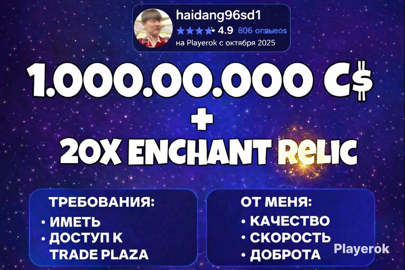 💎Приобретая данный лот, вы получаете внушительную сумму 1.000.000.000 C$ + 20Х ENCHANT RELIC и приятный БОНУС в |Монеты будут проданы через Plaza| - Указанная здесь сумма включает налог за торговую точку, поэтому вы получите чистую сумму. - Добавьте +10% к цене, например, 1,1 млрд за 1 млрд C$. - Пожалуйста, укажите ваше имя пользователя при оформлении заказа. - Убедитесь, что у вас есть бесполезный скин для торговой точки (если он для вас важен, я обменяю его обратно).