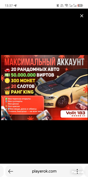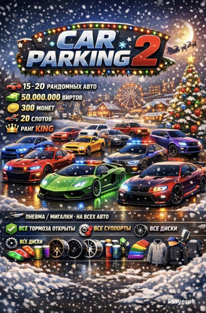🚘 В наличии 15-20 уникальных автомобилей 💰 Общий баланс — 50 000 000 виртов и 300 монет 📦 Всего 20 слотов для машин 👑 Ваш уровень — Ранг KING 🔧 Пневма и мигалки — у каждой машины ✅ Все тормоза полностью разблокированы ⚙️ Всякие суппорты и детали 🛞 Любые диски и колёса 🎨 Широкий выбор красок 🏡🛍️ Весь ассортимент вещей, домов и паков — в нашем магазине