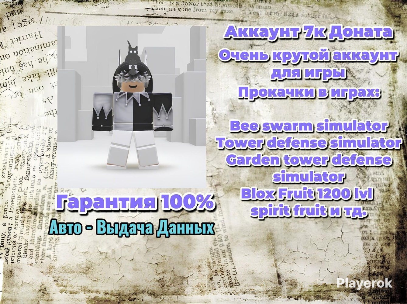 Приветствую вас в моём магазине HellCrimm Shop🍀 Покупаю данный аккаунт вы получите САМЫЙ ЖИРНЫЙ АККАУНТ В ИСТОРИИ РОБЛОКСА⭐ • 7k+ Total (потраченные робуксы) • ОЧЕНЬ МНОГО ВЕЩЕЙ, МОЖНО ДЕЛАТЬ РАЗНЫЕ СКИНЫ⭐ • ОЧЕНЬ МНОГО ПРОКАЧЕК В РАЗНЫХ ИГРАХ⭐ • На аккаунте есть прокачки : СУПЕР ЖИРНАЯ ПРОКАЧКА В Bee Swarm Simulator⭐ •Очень крутой скин на аккаунте 💦 🟥обязательно прочитать:🟥 🟥После оплаты возврат не делается🟥