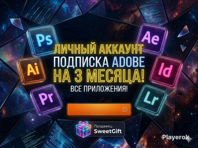 Не слетает! Работает без сбоев весь срок: купили, авторизовались, пользуетесь. Никаких проблем! Официальная подписка Adobe Creative Cloud Все приложения: ✅ Пакет Adobe Creative Cloud «Все приложения» включает более 20 программ, среди которых: Photoshop, Lightroom, Illustrator, Acrobat Pro, Premiere Pro, InDesign, Adobe Express, After Effects, XD, Dreamweaver, Animate, Audition, Character Animator, Dimension, Fresco, Bridge, Media Encoder, Prelude, Fuse и другие ✅ Доcтупны все последние обнoвления, новейшие функции ИИ Аdоbе FirеFly, инструмент «Генеративная заливка». ✅ 80 ГБ облачного хранилища. ✅ Работает на двух устройствах Шаги оформления: 1️⃣ После оплаты мгновенно предоставляем готовый аккаунт. 2️⃣ Скачайте и установите официльные приложения, если они отсутствуют, после чего авторизуйтесь с полученными данными. Если приложения установлены, то просто перезайдите с полученными данными. 💬 Пишите, будем рады ответить на ваши вопросы