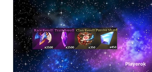 Передаю вам: 2500 Race Rerol, 2500 Trait Rerol, 350 Clan Rerol, 450 Passive Shard.