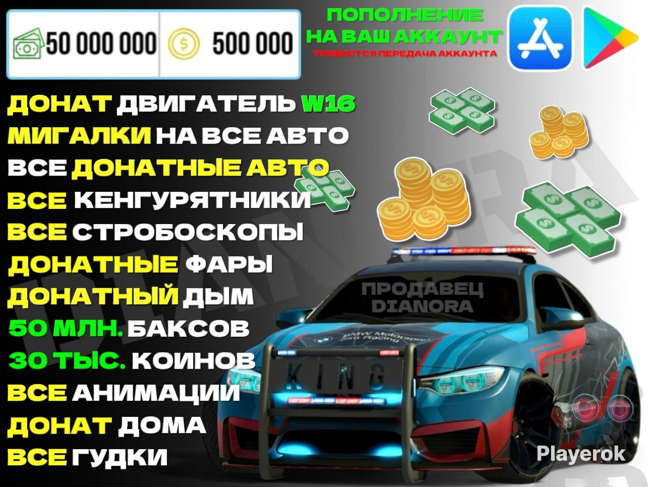 ⭐️ Привет, я Dianora, помогу тебе пополнить баланс в игре по выгодной цене для ios и android. 🚀 Что вы получаете? ✔️ 500к коинов; ✔️ 50кк баксов; ✔️ Все гудки; ✔️ Донат дома; ✔️ Все анимации; ✔️ Донатный дым; ✔️ Донатные фары; ✔️ Все стробоскопы; ✔️ Все кенгурятники; ✔️ Все донатные авто; ✔️ Мигалки на все авто; ✔️ Донат двигатель W16. ❗️Мигалки будут установлены на все авто, которые стоят у вас в гараже, на момент выполнения заказа и на авто, которые будут куплены мной. ❗️Покуются только авто за донат, машины за коины не учитываются. 📲 Требуется передача аккаунта, так как мне нужно загрузить ваш прогресс из облака. ❗️ВАЖНО❗️ ⭐️ Не приобретайте данный товар, если вы пользуетесь мировым рынком винилов. После пополнения баланса на 500 тысяч коинов рынок перестанет работать. ⭐️ Если вам нужно чтобы мировой рынок работал, в профиле можете выбрать пополнение на 30 тысяч коинов. ❗️ Не приобретайте данный товар: если вы не знаете данные от вашего аккаунта игры либо не хотите передавать аккаунт. Возврат после оплаты не будет осуществлен. 1 - Передаете аккаунт; 2 - Я захожу и пополняю баланс; 3 - Я пишу вам что все готово и вы проверяете. ⚠️ Часто задаваемые вопросы: ✔️ Коины по ид передавать нельзя; ✔️ Можно играть онлайн❓- Да, можно! ✔️ Почему именно 30к коинов❓- Если покупать больше 30к коинов на аккаунт, рынок винилов World Sale пропадет и не будет работать. ♻️ Во время выполнения заказа, вы не заходите на аккаунт.
